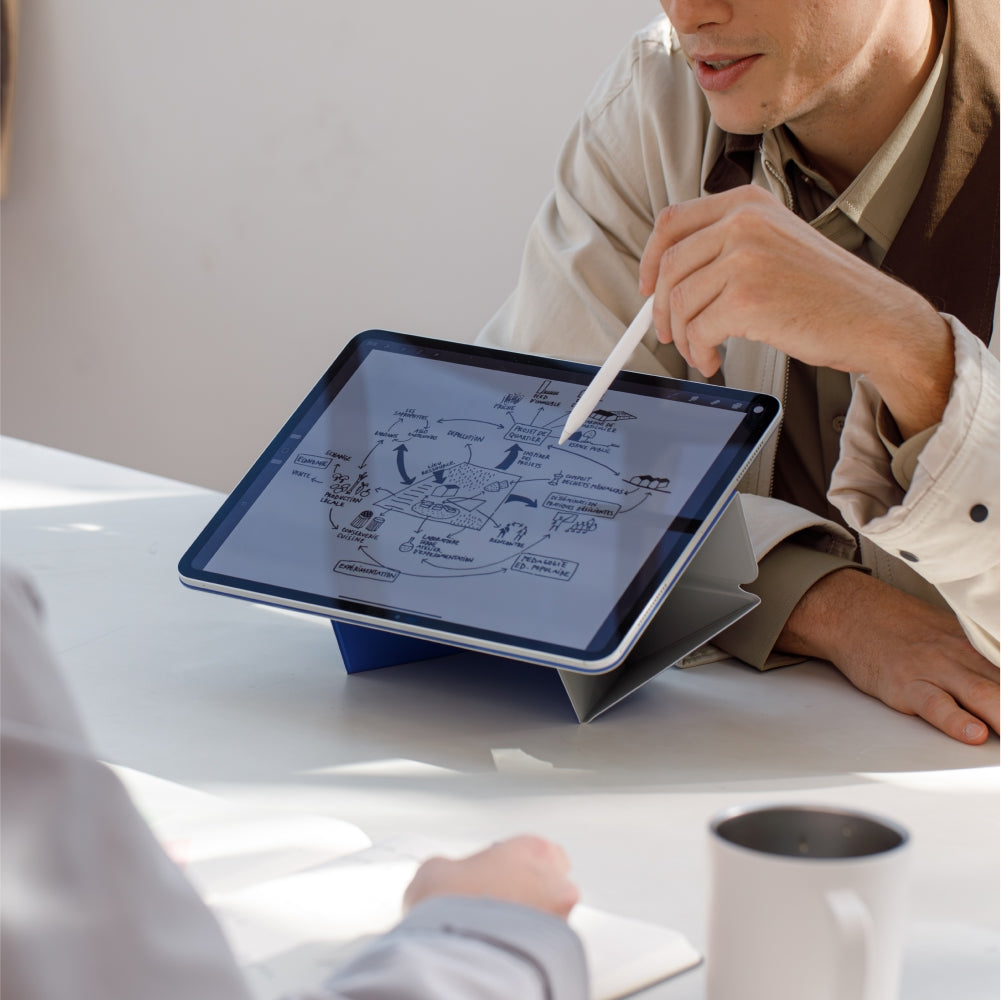 iPad Pro (M4) 11インチに装着します。磁力で本体とMOFTダイナミックフォリオはくっつきます。ケースとしても折れ線のあるところはフニャフニャになることなくケースとして液晶面をカバーしてます。