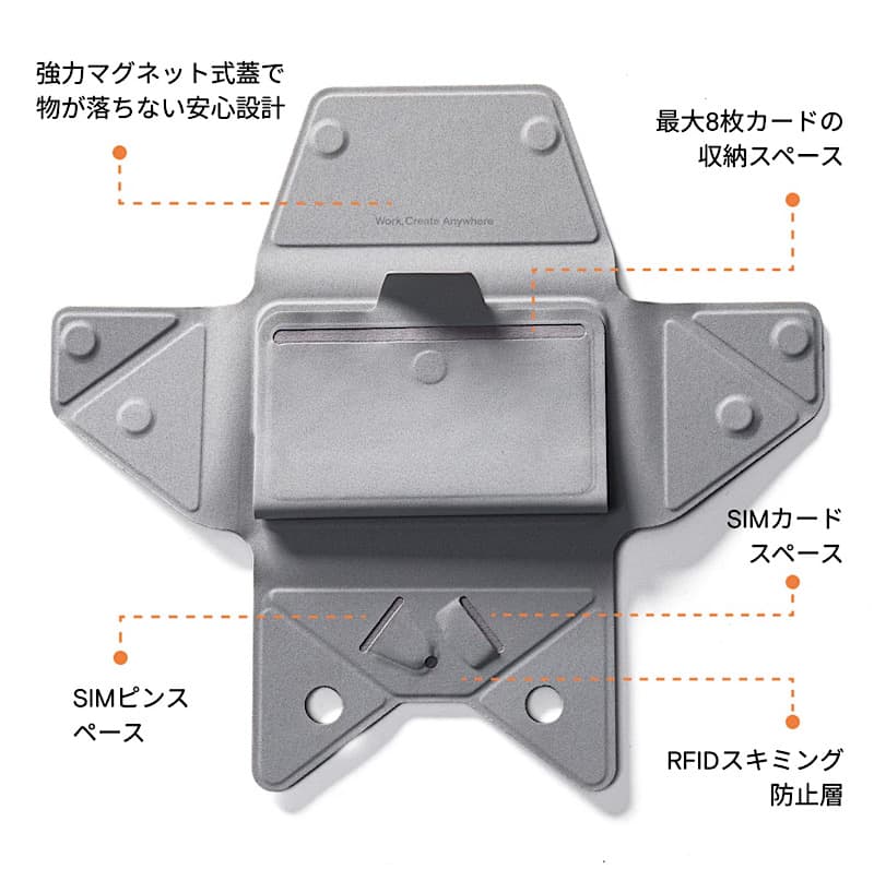 カードは、手前部分、ポケットタイプの部分、その後ろの部分と3層のスペースになっます。またSIMカードを使っている方には便利なSIMピン、SIMカードを入れるポケットもあります。また地味な部分ですが、可動部分は薄く曲げやすくなっていたりとよく考えられています。