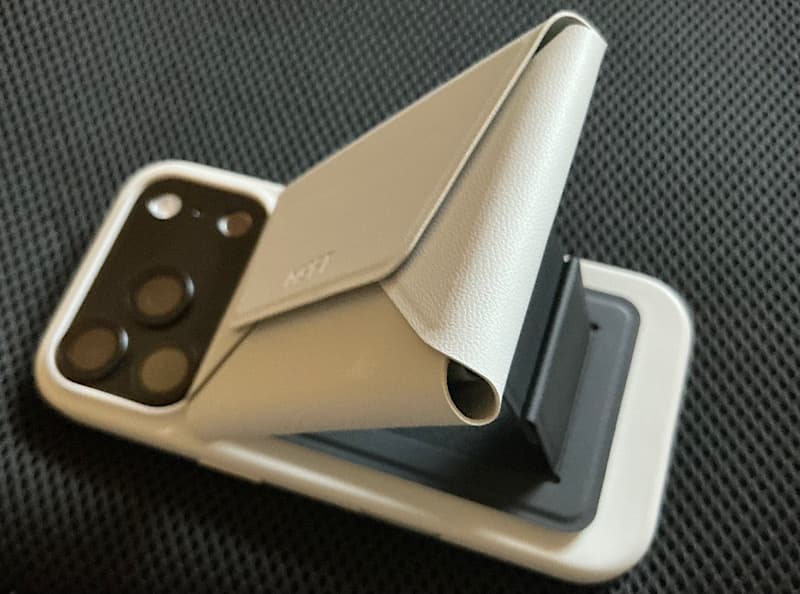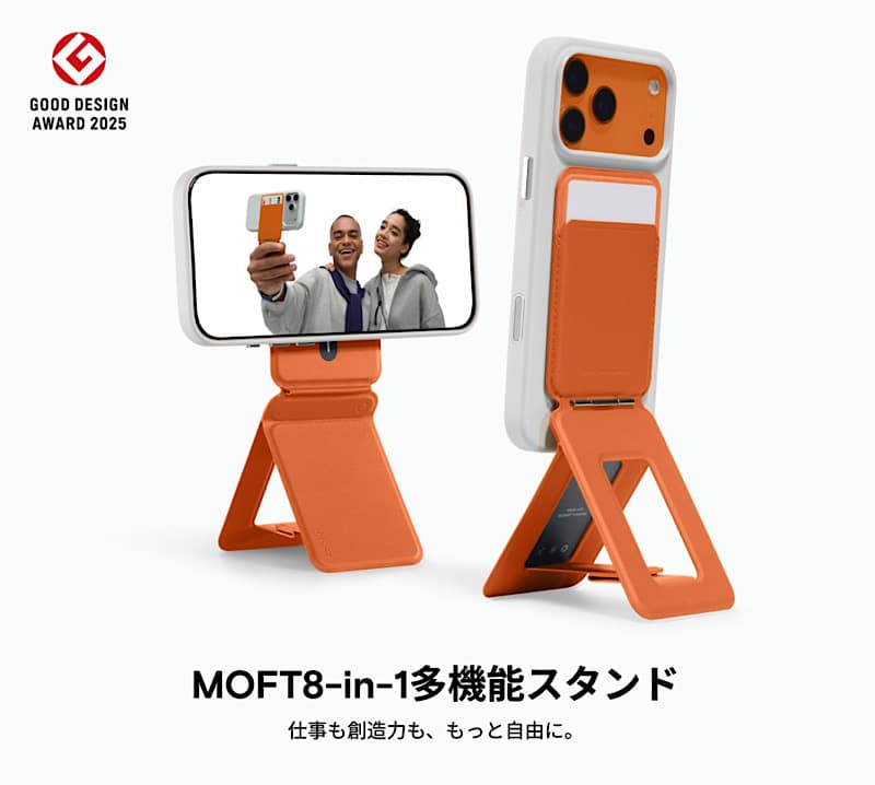 MagSafe対応のMOFTのケース。他にも2025年のグッドデザイン賞にも選ばれたMOFT8-in-1多機能スタンドや、メモ帳になるインスピノートも持ってて、どう使い分けるか考えました。