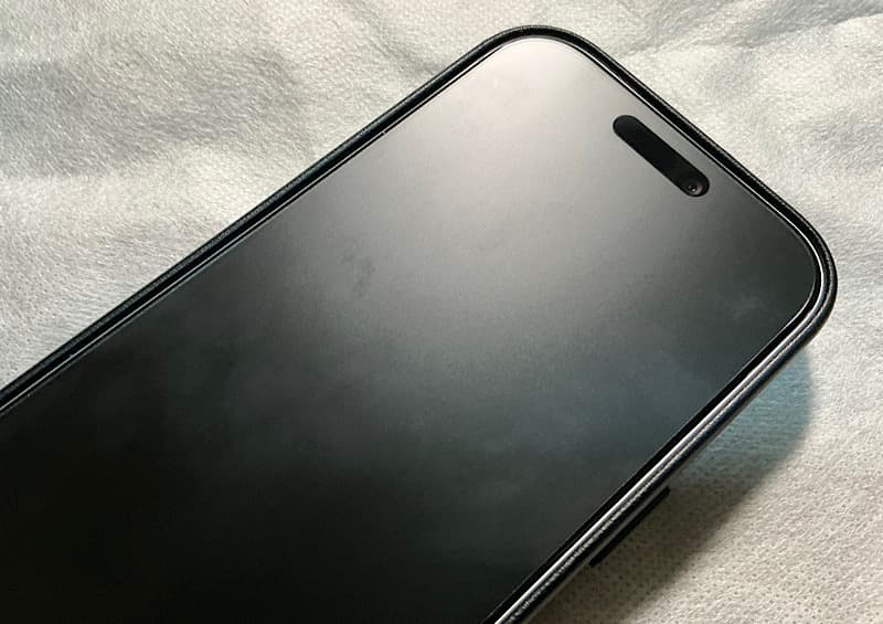 液晶側は、これもNimasoのものですが、アンチグレアのガラスフィルムにしています。インカメラのところはFace IDのためクリアになっています。
