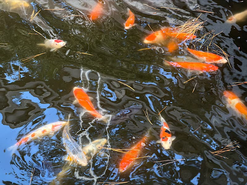 お参り、お札やお守りを手に入れ、帰りの池を見ると鯉がいっぱい。お腹空いてそうでした。