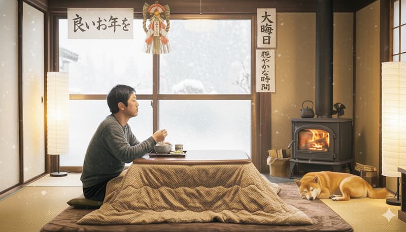 アイキャッチ画像は、またまたGeminiやChatGPTで画像を作ってみましたが、作ってみた他の2つの画像もここに紹介。1人の大晦日(ペットと一緒に)ってプロンプトだとこんな感じみたいです(実際はペットを飼っていませんが)。寒いので窓開けない&部屋内に雪降ってる等ツッコミどころはあり、部屋は、どの画像も遠く離れているのですが(そもそも暖炉もこたつも無い)、年越しそばは食べながら、紅白歌合戦を見るか、そのまま寝て初日の出のため早起きするか、そのときに考えたいと思います。アイキャッチの方は、「良いお年を」を入れてと追記したら、書道とは。いろいろな視点があるのは面白いです。