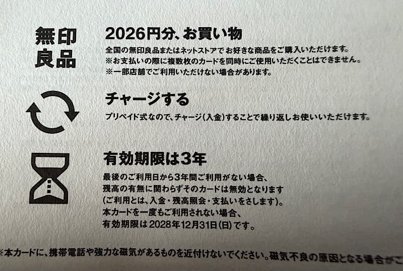 2,026円分のお買い物(ネットストアでも可能)。チャージ可能。有効期限は3年。無くさないようにしないと。というかすぐ使ってしまいそうな予感も。