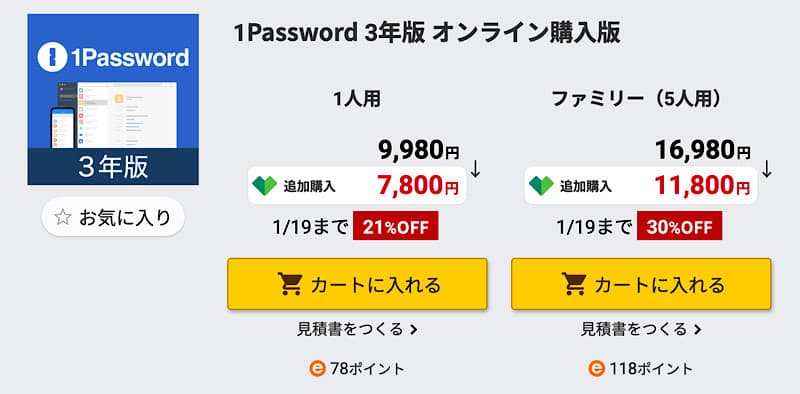 今回、私はAmazonの初売りセールで購入しましたが、ソースネクストから販売されている、3年版1人用が、12,800円のところ、9,980円で購入しました。3年版なので、1年あたり4,267円。1Password.comよりも安いです。