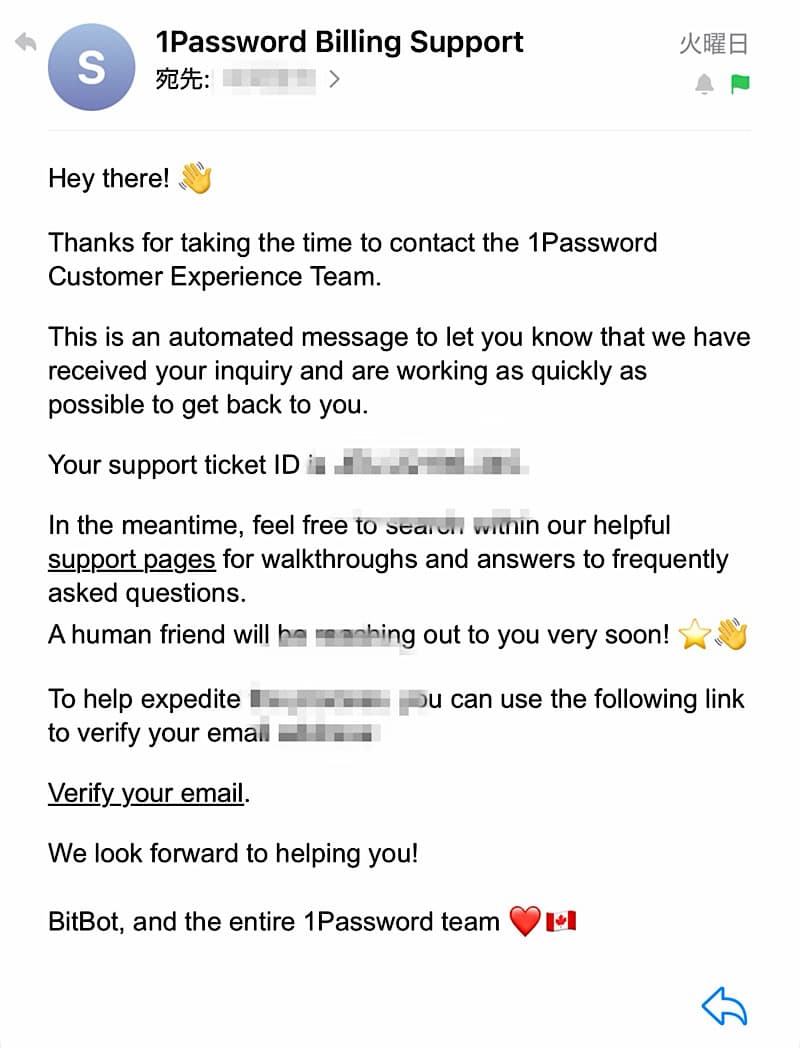 手続きが完了したので、再度1Password.comへメールで連絡しました。そうすると返信がありました。(ちなみに、だいたい返信から回答には時差の関係か、1日くらいかかります)