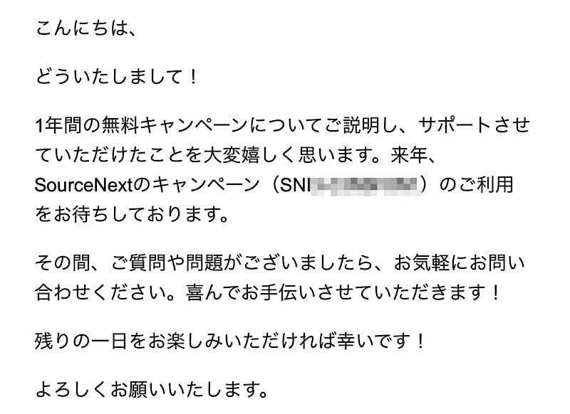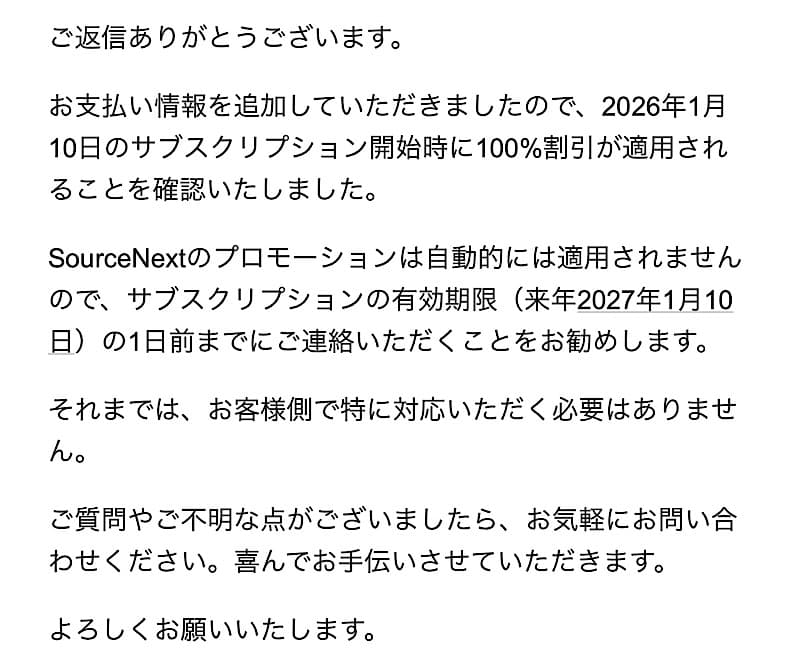 ここで注意としては、ソースネクストの登録は済んでいるので、1年後の無料トライアルが終わるタイミングで、メール連絡する必要があるということです。忘れずにメール自体を、リマインダー登録しました。