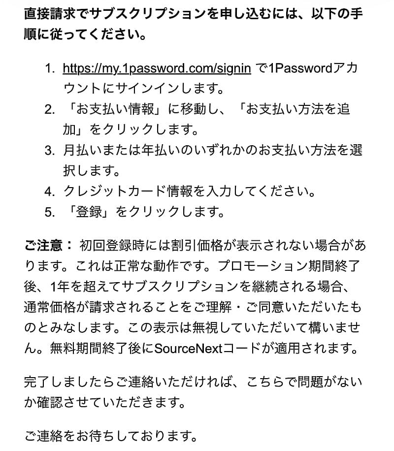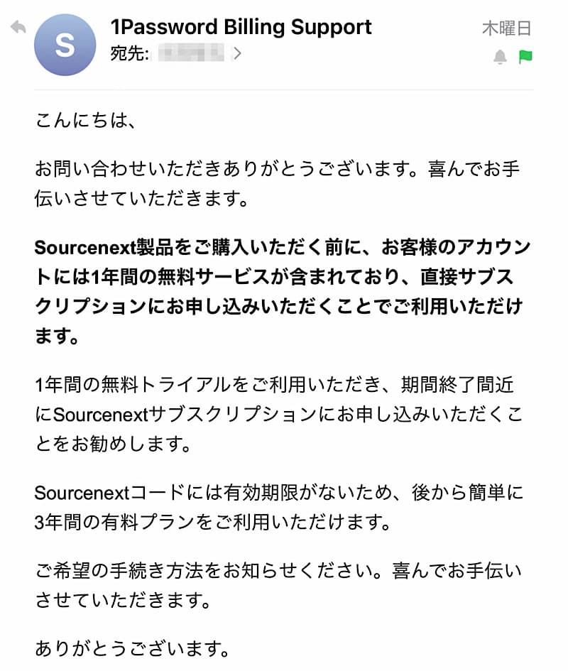 というところで1年後にソースネクストの3年版を登録するためメールすることで更新されることがわかりました。1Passwordのサポートが手厚く安心できる内容だったのでとても良かったです。