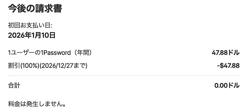 このとき(2026年1月10日時点)1Password.comでは、普段よりも安くなっていました。年払いの場合、月額$2.99USDなので、この記事を書いているときの為替が1ドル157.89円で計算すると年払いの場合、月額473円。つまり1年5,666円。App Storeよりも30%安い結果となります。円高になったときにも計算したくなります。