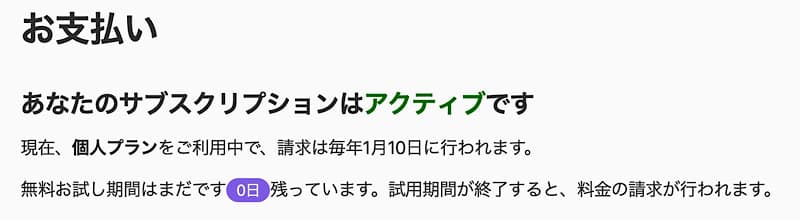そして、アカウント情報を見たところ、表示が変わっていました。14日間のトライアルはギリギリでしたが、見れなくなるわけではないので、あまりそこは気にしませんでした。