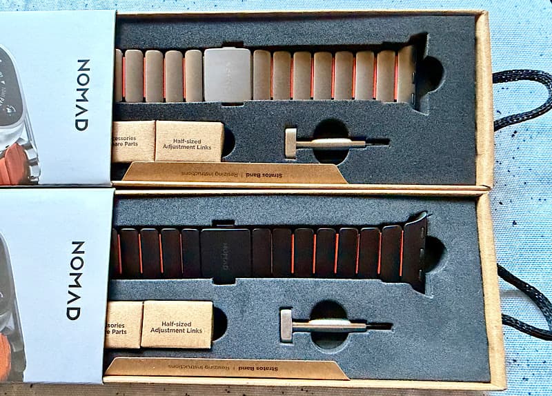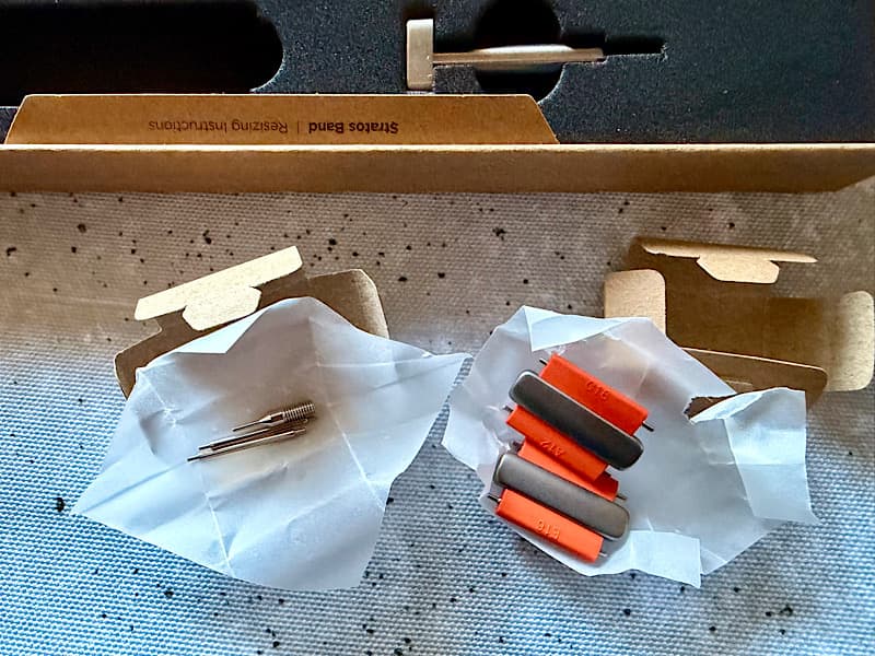 やっぱり高価なだけあって、しっかりした箱から、バンド以外にも長さ調整用のツールや予備のパーツが入っています。