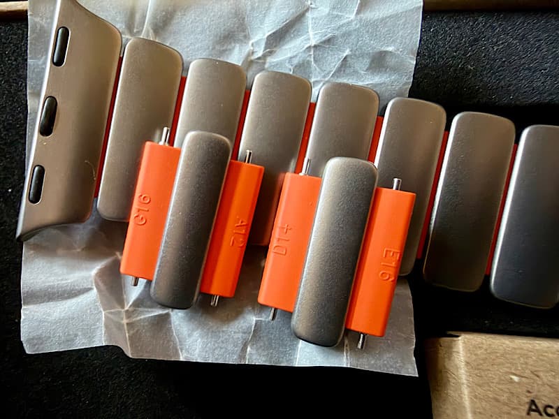 そして外したパーツのチタン側の裏には番号もふってて、間違えないようにしてくれてます。調整時のピンはバネ式なので取り外しも簡単でした。