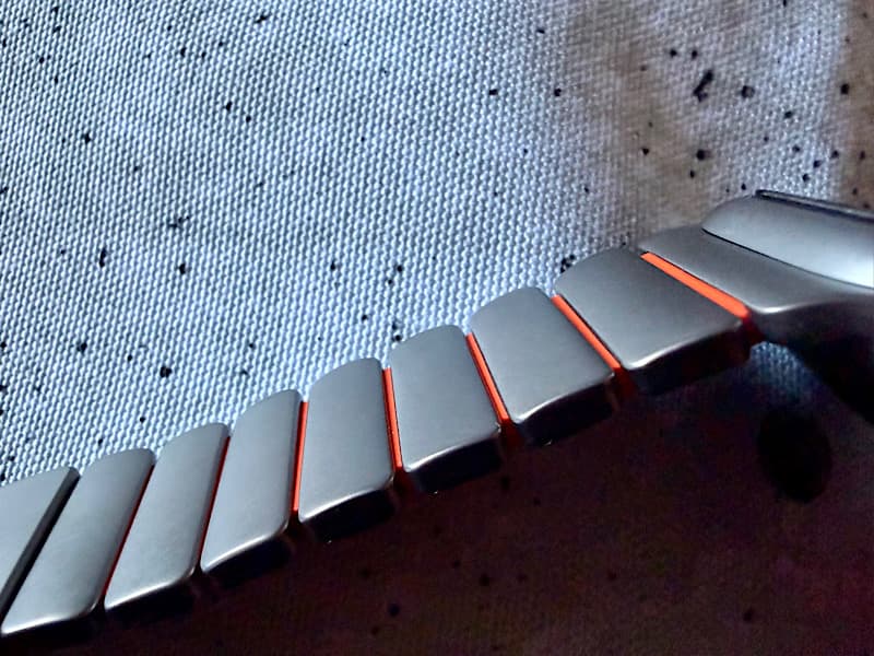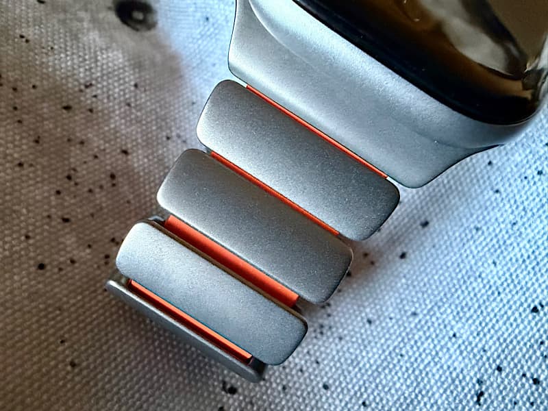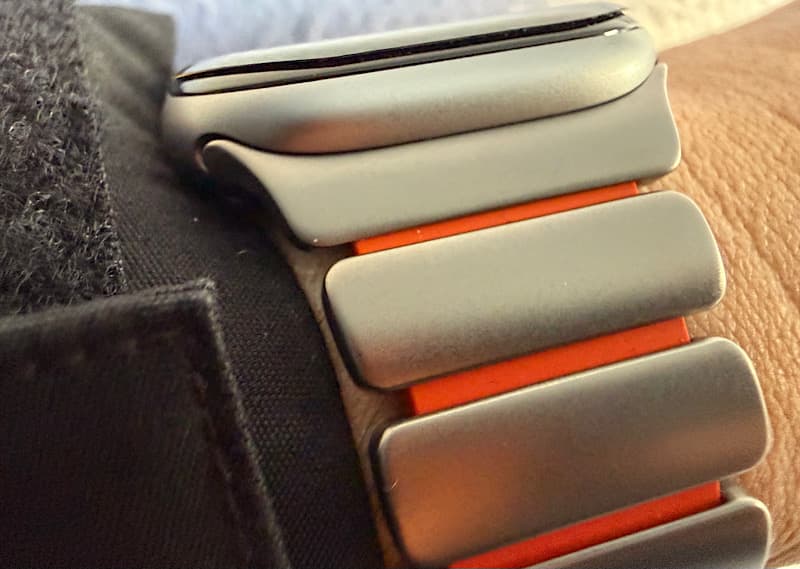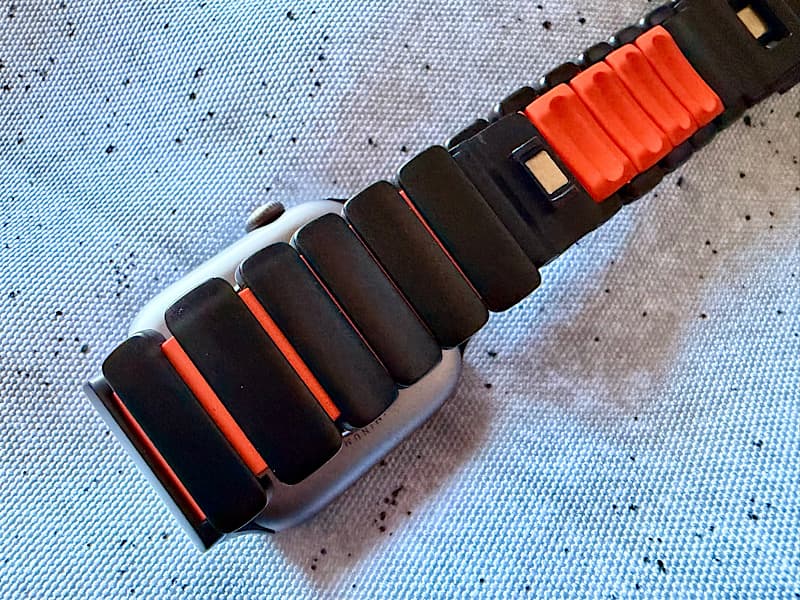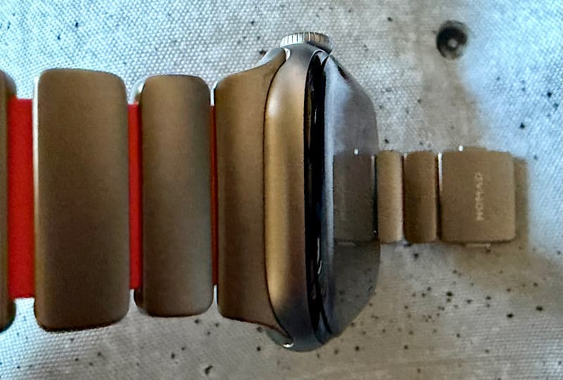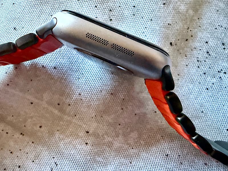 Apple Watchへの取り付けは、他のベルト同様、横からスライドした取り付けます。このような起き方をすると、オレンジ色はほとんど見えませんが、そこが良いと思ってます。