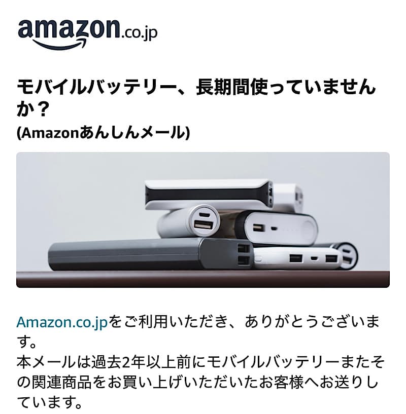 少し前から気になっていたPHILIPS(フィリップス)のモバイルバッテリーがタイムセールで5,000円切っていたので購入しました。その前に、Amazonから以下のメールが届いたのもきっかけの1つですが、そろそろ買い替えを考えていました。こういう注意喚起のメールも嬉しいところです。