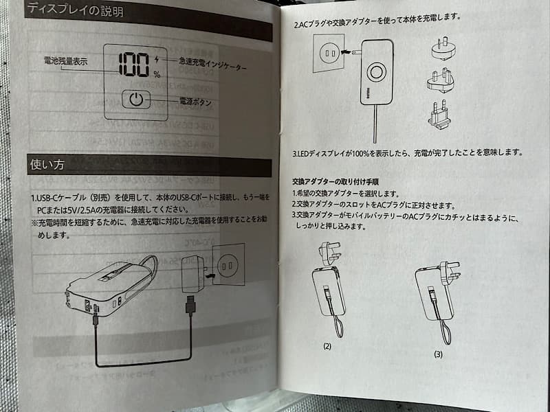 入っているものは、モバイルバッテリー本体x1、AC交換アダプターx3、説明書。説明書は、日本語で書かれていて、後半英語で書かれています。保証期間は一年間になります。