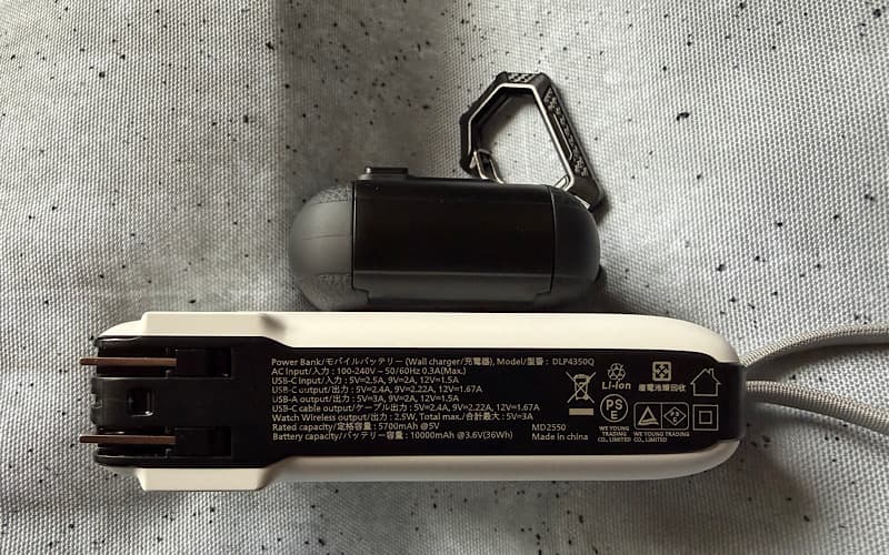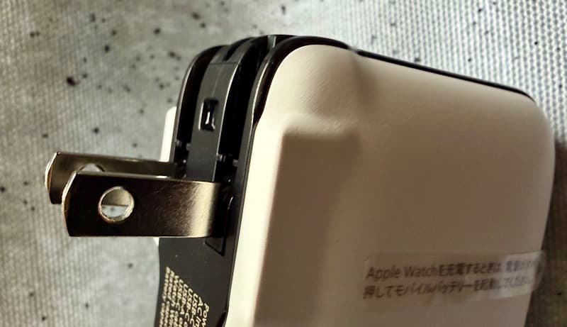 モバイルバッテリー本体には、Apple Watchを充電するためのくぼみがあって、ストラップになっているUSB-Cケーブルが付いてます。コンセントは折りたたみ式の一体型。本体だけでモバイルバッテリーに充電ができます。