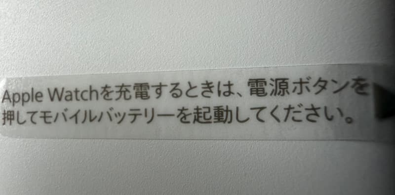 充電ができないなどの問い合わせがあったのかはわかりませんが、本体にシールが貼っていて、Apple Watch充電の際には、電源ボタンを押してモバイルバッテリーを起動してくださいと書かれています。すぐ、跡も残らず、はがせるようになってます。