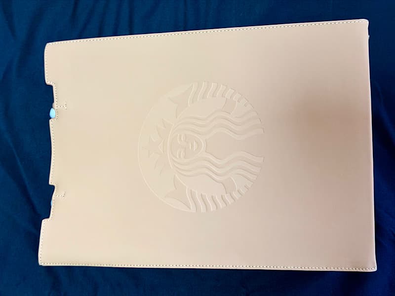 マイカスタマイズジャーニーセットのメインであるレザートートバッグ。大きなスタバの刻印があって、反対側には刻印は無いのでショルダーストラップを使って持ち歩くときに、刻印を見せたくない場合は裏側で持ち歩くことができます。縦の長さは約35.5cm x 横の長さは25.5cm x マチ12cm。13インチのノートパソコンも入るサイズです。