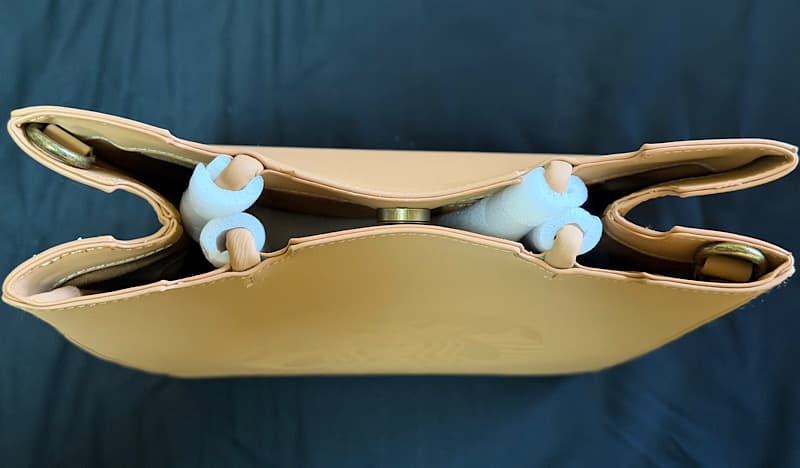 届いたときの真上からの状態です。手持ちの部分もカバーされてて、高級品っぽい印象を受けました(実際、高かったんですが)。そしてショルダーストラップが左上と右下に付いているのがわかります。また段ボールの中には、これだけしか入ってなかったので、中に詰まっているのが覗いてわかりました。
