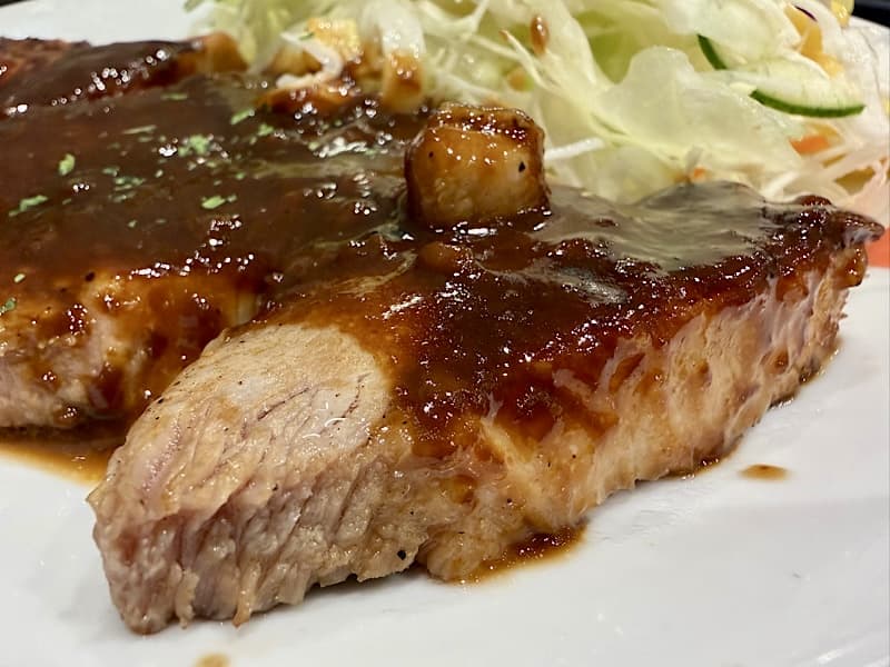 分厚い見た目からは想像できないほど、ジューシーで分厚い豚肉は、香ばしい旨みと、とろけるような脂身の甘みが口いっぱいに広がります。